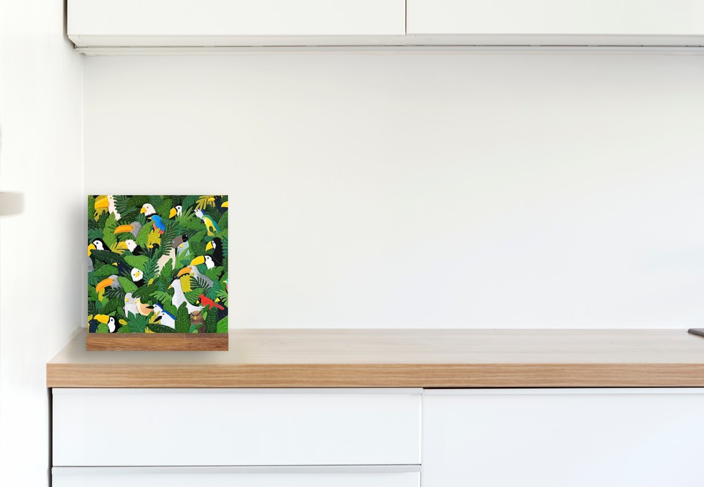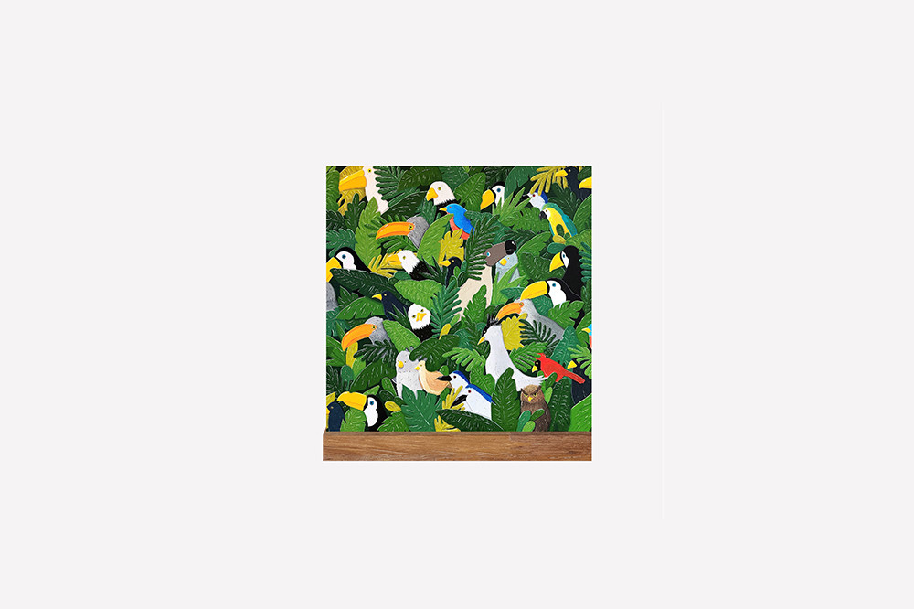 열대나무의 잎사귀와 그 안에 숨어있는 새들이 패턴과도 같은 구성을 이루는 작품입니다. 녹색과 그 안에 포인트를 이루는 색상이 함께 어우러져 공간에 활기와 생기를 불어넣어 줍니다. 화면을 채우고 있는 풀과 새들의 모습이 조화롭습니다. 정글에 숨은 다양한 새들을 찾아보는 재미를 느끼게 해주는 작품입니다.