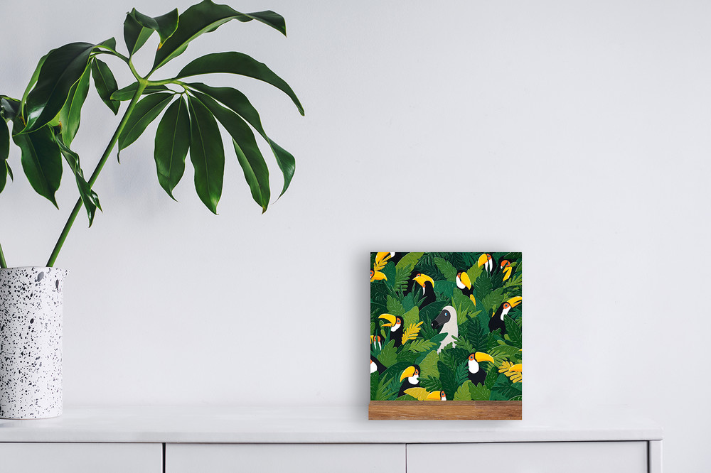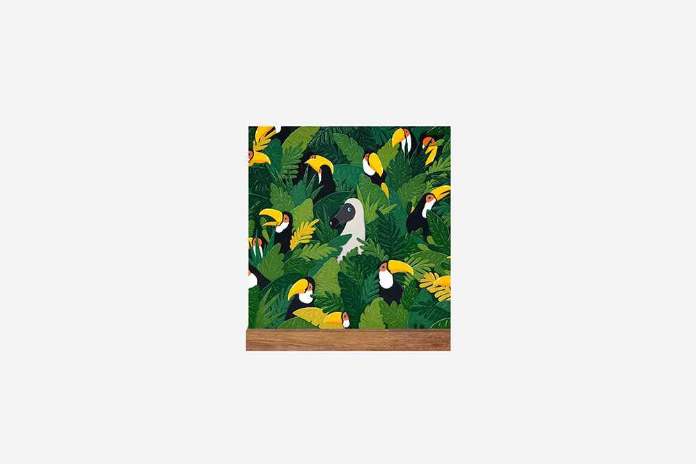 열대나무의 잎사귀와 그 안에 숨어있는 새들이 패턴과도 같은 구성을 이루는 작품입니다. 회색빛의 도도새, 검은색, 노란색이 멋지게 어울리는 구관조가 열대우림과 어울려 세련된 분위기를 연출합니다. 강렬한 색상이 군더더기 없는 조화를 이루는 작품으로 공간에 활력을 불어넣습니다.